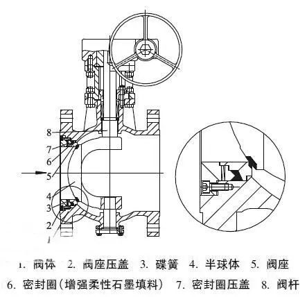 進口偏心半球閥密封副的特點是閥門關閉時,閥座壓蓋壓緊碟簧,由碟簧推動密封壓蓋和閥座向半球體壓緊,并使碟簧在設計變形范圍內,使密封副之間的作用力達到密封必須比壓,真空技術網認為這樣可以保證閥門在低壓時不發生內漏現象。在閥門啟閉過程中,閥座、密封壓蓋和密封圈作為一個構件隨著半球體開啟角度的變化在管道軸線方向適量懸浮移動,在介質壓力作用下向半球體壓緊,其向閥瓣壓緊的作用力隨著介質壓力的升高而增大,從而達到自密封效果。