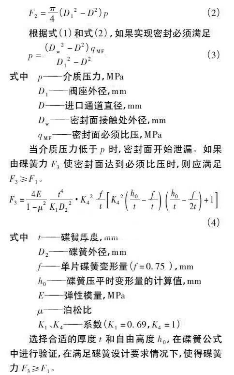 (1) 密封預緊力。通過螺栓產生一定的預緊力,再由閥座壓蓋傳遞給碟簧,使得碟簧產生變形。為了延長碟簧使用壽命,碟簧的變形量不能超過自由高度的75%,通過系列力的傳遞使密封副達到設計的密封比壓。